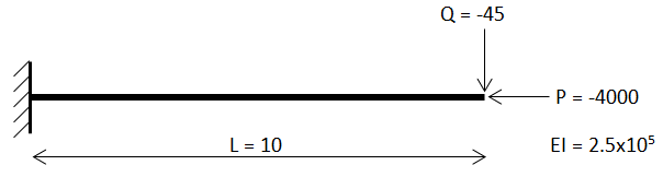 A 10 long cantilever is subjected to a lateral tip load of 45 and an axial tip load of 4000.