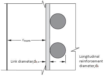 The nominal concrete cover is the distance between the surface of the reinforcement closest to the nearest concrete surface (including ties and surface reinforcement where relevant) and the nearest concrete surface.
