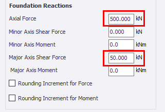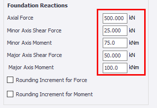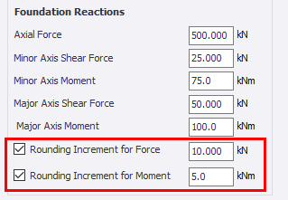 The ‘Minimum Design Forces’ inputs under Foundation Reactions allow the user to specify minimum values for the reactions, and also apply rounding increments to them.