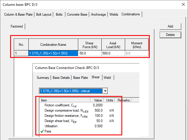The base plate connection is now designed for the minimum shear of 50 kN and for the minimum axial load of 500 kN specified by the user.