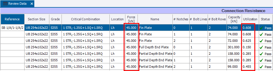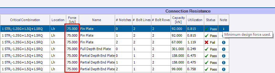 By closing and re-opening the Connection Resistance Review Data once again, the connection resistance check is updated to use the specified minimum design force.