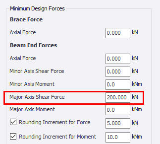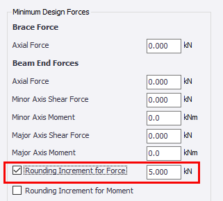 The ‘Minimum Design Forces’ inputs under Brace Force/Beam End Forces allow the user to specify minimum values for these forces, and also apply rounding increments to them.