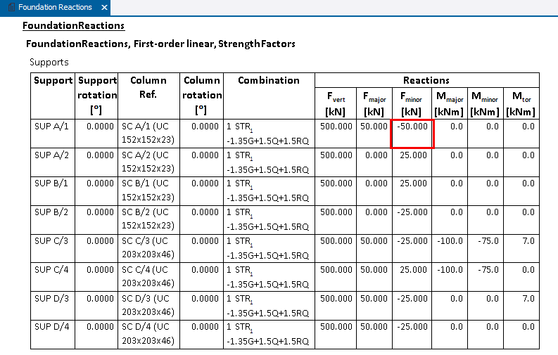 The Foundation Reactions report shows minimum design forces/moments specified by the user.