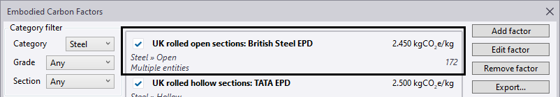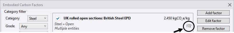Embodied Carbon Factors dialog box