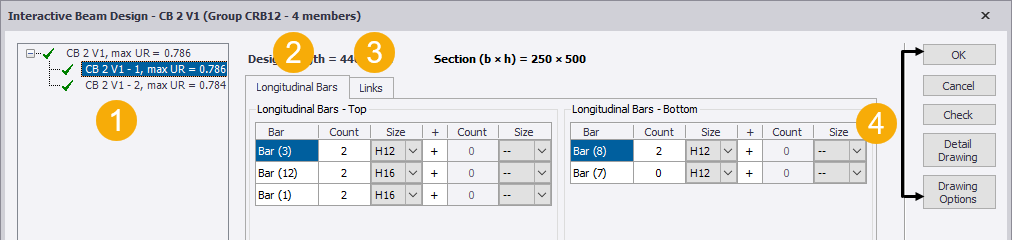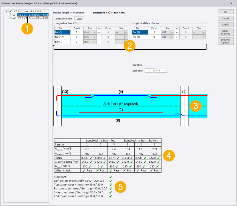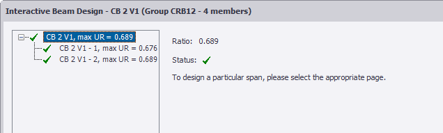 The Interactive Beam Design dialog box shows the current reinforcement and check results for each beam span in the selected beam line. When any of the editable fields are changed, the checks are re-run and the results are updated; enabling you to quickly see the effect of each change you make to the reinforcement.