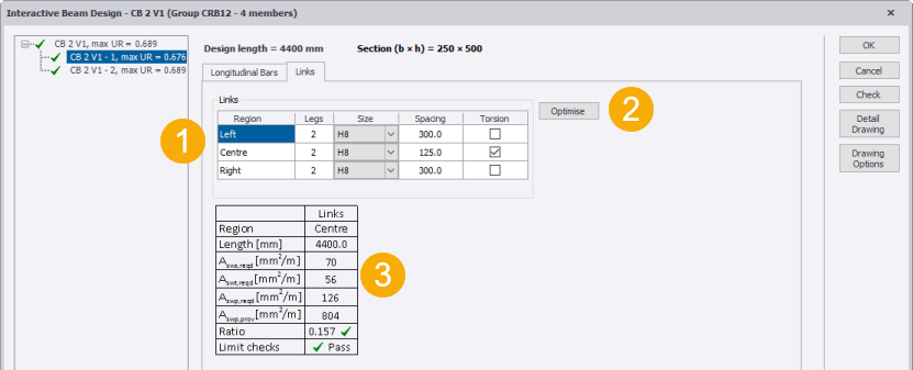 Optimise Button : This calculates the optimum length of the central region given the reinforcement that you have selected. The button is not be visible when the beam is in a design group with other beams, and is also not visible when the span is a cantilever.
