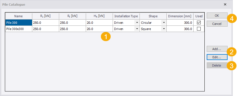 The Pile Catalogue is used to add or edit pile dimensions and capacities.
