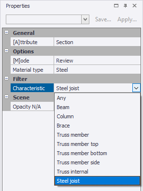 When Section/Material Grade is selected on the Review ribbon, in the properties under Characteristic there is now a “Steel joist" option. Previously, steel joists were only included for section/material grade review views when "Any" was selected under Characteristic.
