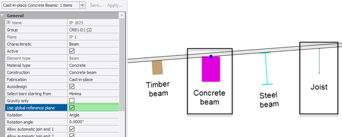 In response to customer feedback, the default behavior has been amended so that for concrete beams and joists/joist girders only, by default the minor (z) axis is now vertical (i.e. aligned with global Z). To facilitate this a new Use global reference plane property has been introduced.