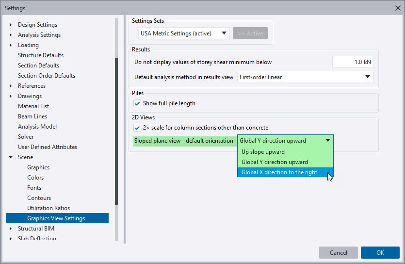On the Scene > Graphics View Settings page in the Settings dialog, you can specify the orientation for newly created views using the Sloped plane view - default orientation setting. (This global setting gets copied to the Graphics View Settings page in Model Settings should you want to change the default for the currently open model.)