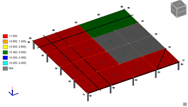 Once a slab deflection analysis has been performed, the Slab deflection status and utilization are available for display in the Slab Deflections View regime.