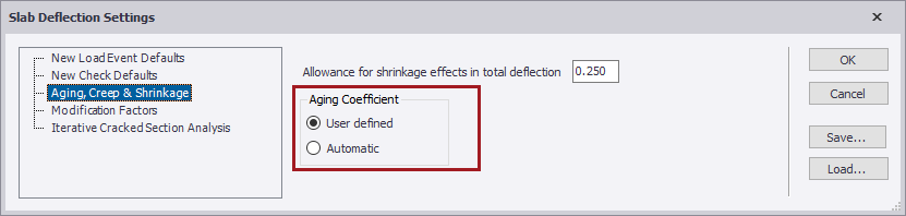 The Aging, Creep and Shrinkage page on the Slab Deflection Settings dialog allows you to choose the method for this.