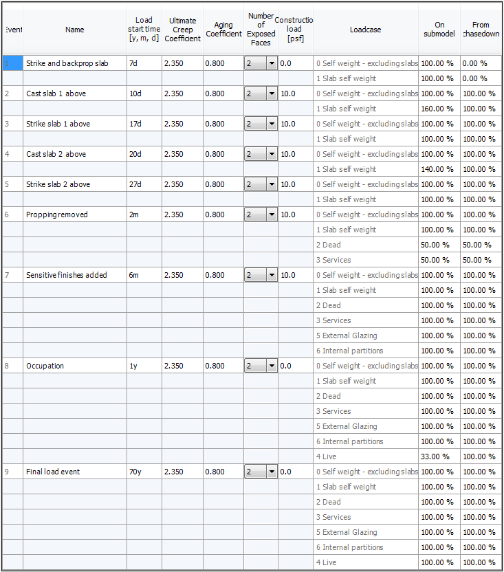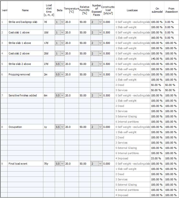 Note the increased slab self weight when casting slab 1 above and slab 2 above where an additional 60% and 40% of the slab weight is being supported respectively. This is defined in the On submodel % column.