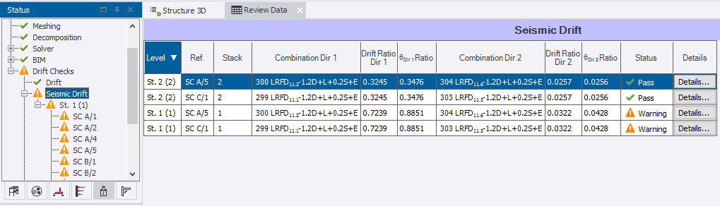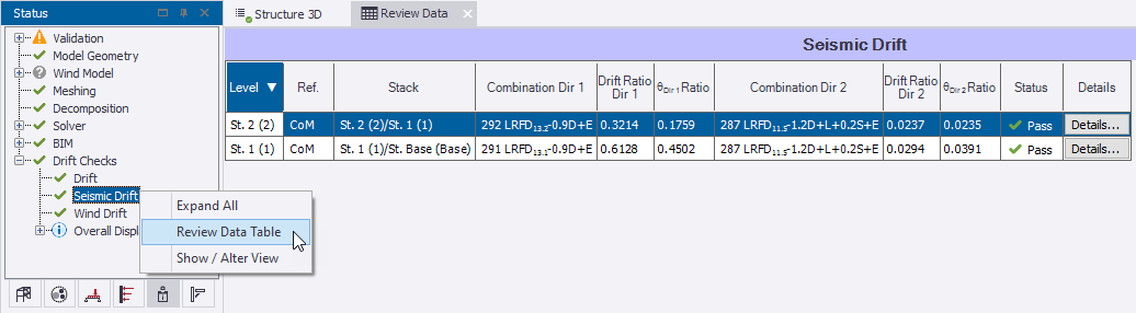 The Seismic Drift check results can be accessed from the Status tab in the Project Workspace as shown below.