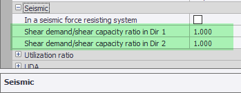 When working to the ASCE 7 code, the engineer can directly define the shear demand / capacity ratio (beta) for columns and walls. The default value of 1.0 could be over-conservative. This option is located in the “Seismic” group of member properties, and can be set separately for 'Direction 1' and 'Direction 2' and for each stack/panel, as shown in the picture below.