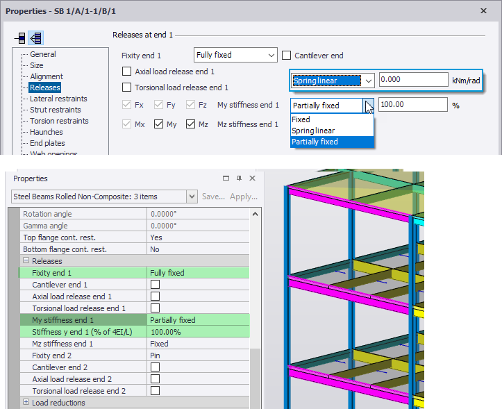 The partial fixity option is especially useful for example when modeling precast concrete structures in which it is common to consider some amount of end fixity, but not full end fixity (which is commonly assumed for in-situ concrete buildings).
