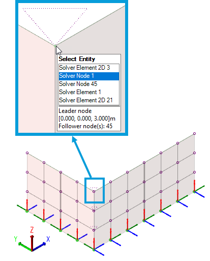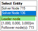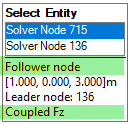Two coupled coincident solver nodes are shown above. One of the nodes (136) has been designated the Leader and the other (715) the Follower. The Leader’s tooltip indicates its Follower node, the Follower‘s tooltip indicates its Leader node and the degrees of freedom that are coupled. The coupled degrees of freedom are also listed in the Properties window for the Follower node.