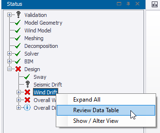 The sway/drift, seismic drift and wind drift check results for all column stacks and wall panels at a specific level can be excluded from the tabular review data as follows: