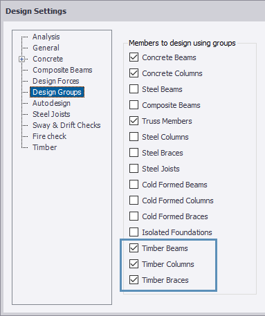 Timber beam, column and brace design groups are activated as follows: