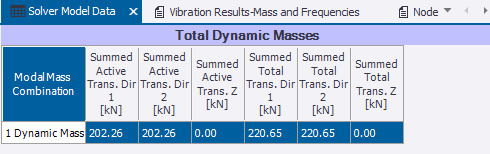 The dimensionless unity value from a mass-normalized mode shape, while mathematically convenient, does not by itself provide physical insight into the mode’s properties . For this reason, Tekla Structural Designer reports the unity-normalized modal mass. Reported in the Modal frequencies table the value is expressed in terms of force units rather than mass.