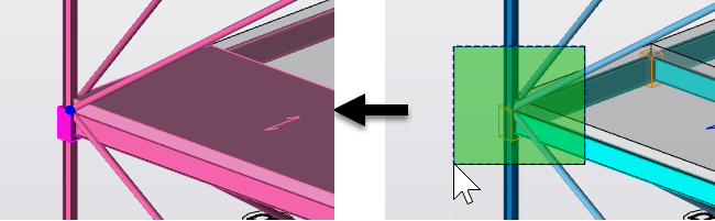 Many Tekla Structural Designer commands require you to make selections. You can make single and area selections from any 2D or 3D view. You can also make selections from the Project Workspace.