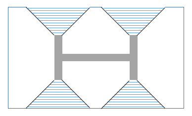 For rods inside the flanges, when there are only 2 rows inside the flanges then for the 4 rods adjacent to the web the nominal tension force is proportioned between the flange and the web, in the ratio dw/(dw+df) to the flange and df/(dw+df) to the web, where dw is the distance from center of rod to centerline of web, and df is the distance from center of rod to centerline of flange; while all other rods in the row use the full nominal tension force. The proportioned tension force to the web does not contribute to plate bending but is taken into account for the required web weld tension strength. When there are 4 rows of rods inside the flanges, the outer 2 rows adopt the tension forces as described above for 2 rows only inside the flanges; while the other 4 effective rods (adjacent to the web) from the inner 2 rows assume the full nominal tension force to the web and so do not contribute to plate bending but are taken into account for the required web weld tension strength.