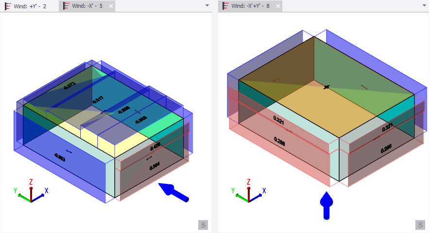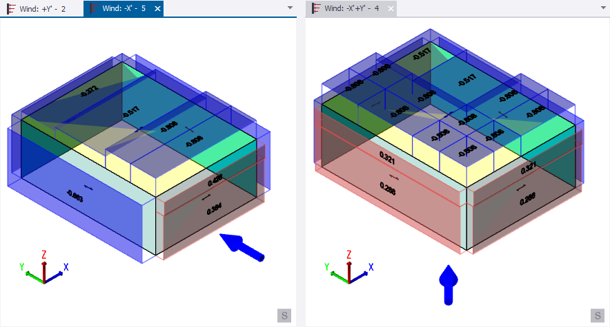An enhancement has been made to address an omission in the implementation of US wind code ASCE7-16 and ASCE7-22 for rigid buildings of all heights. Previously, while roof zones were calculated for wind applied face on (as shown below left), they were not calculated when the wind was at an angle (as shown below right). This was because the code provided no clear guidance for the angled wind. In this situation users were able to manually add loads if they were required.