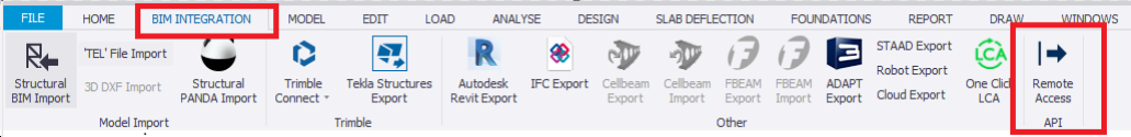 The Remote Access option, found on the BIM Integration ribbon, enables the import of a Tekla Structural Designer model by any application from a remote computer via a secure, authenticated connection.