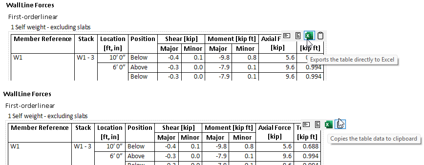 If the design load is different to the max compression and/or tension, then extra rows are added to the table to report the max. compression and/or tension.