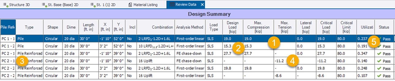 Maximum compression and tension is reported for each pile along with the design axial load.
