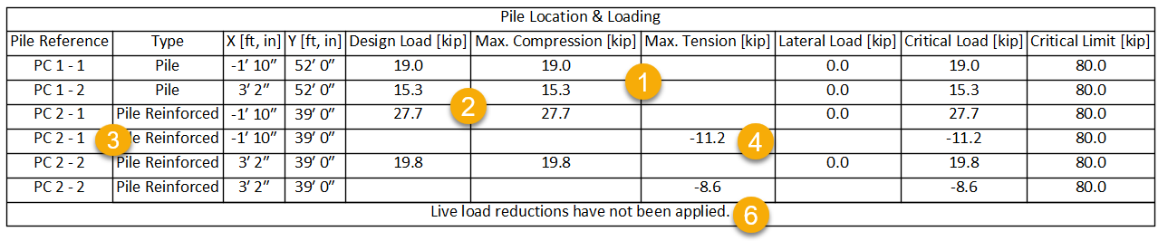 A note has been added in the last row of the Pile Location & Loading table regarding application of imposed/live load reductions.
