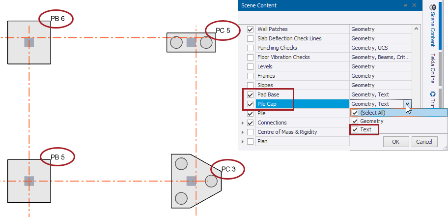 The Label (default or user name) for isolated pad bases and pile caps can now be displayed in a 2D view by choosing the option ‘Text’ in the scene content of ‘Pad Base’ and ‘Pile Cap’. If the pad base or pile cap is rotated, the text label is aligned as per the rotation angle.