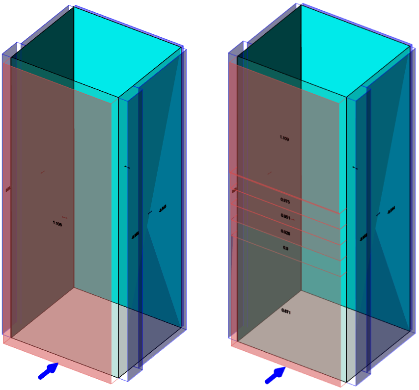 The image on the left shows the zoning on the windward face that would have occurred without using division by parts. The image on the right shows the new zoning. (The central section being divided into 4 parts in this example).