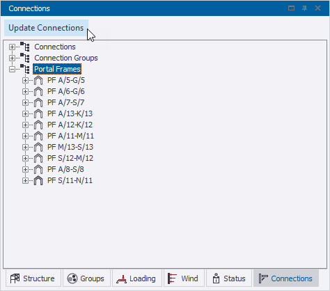 Additionally, a new Update Connections button is now available at the top of the window for ease of use. This allows you to update all connections in the model (including portal frame connections) with a single click. The button operates in the same way as the existing Update Connections command located on the right click context menu of the Connections branch.