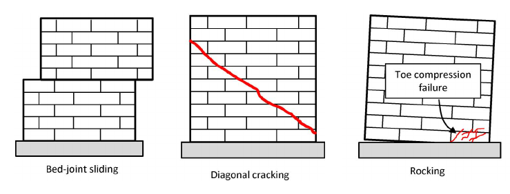 A masonry wall panel resists this force couple at each corner primarily as a shear panel. The failure mechanism either follows a stepped pattern through the joints or by shear bond along the bed joints. The compression strut manifests as a failure in diagonal tension across the bed joints in a stepped fashion. Failure can also occur by local crushing in the top left or bottom right of the wall (or vice versa). These failure modes are depicted in the figure below.