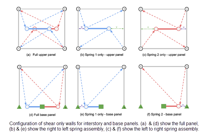 Shear only wall panels are modelled using two axial springs between 'panel nodes' connected to 'corner nodes' by link elements. How these are configured differs for interstory panels and the base panel.