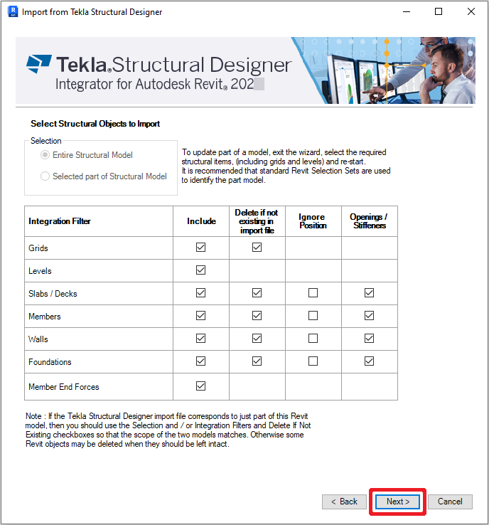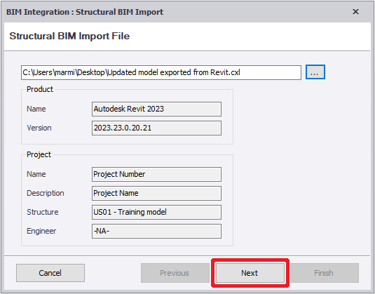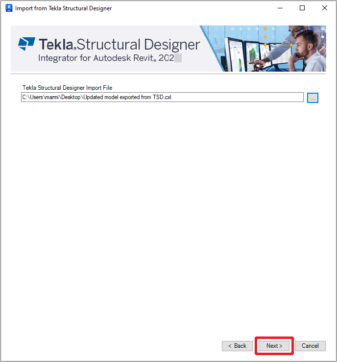 In this example, we are updating an existing model with a new CXL file created from Tekla Structural Designer. The First time import option is therefore disabled and the only option available is Import model into Revit - Update existing model. Click Next to continue.