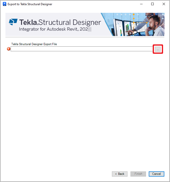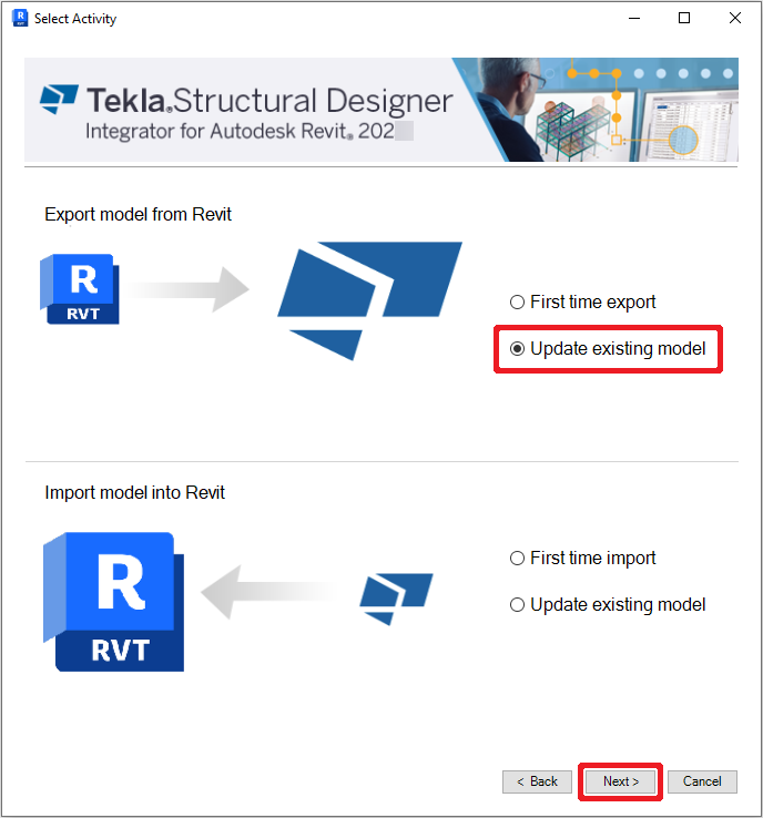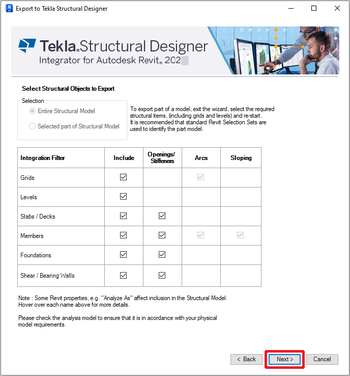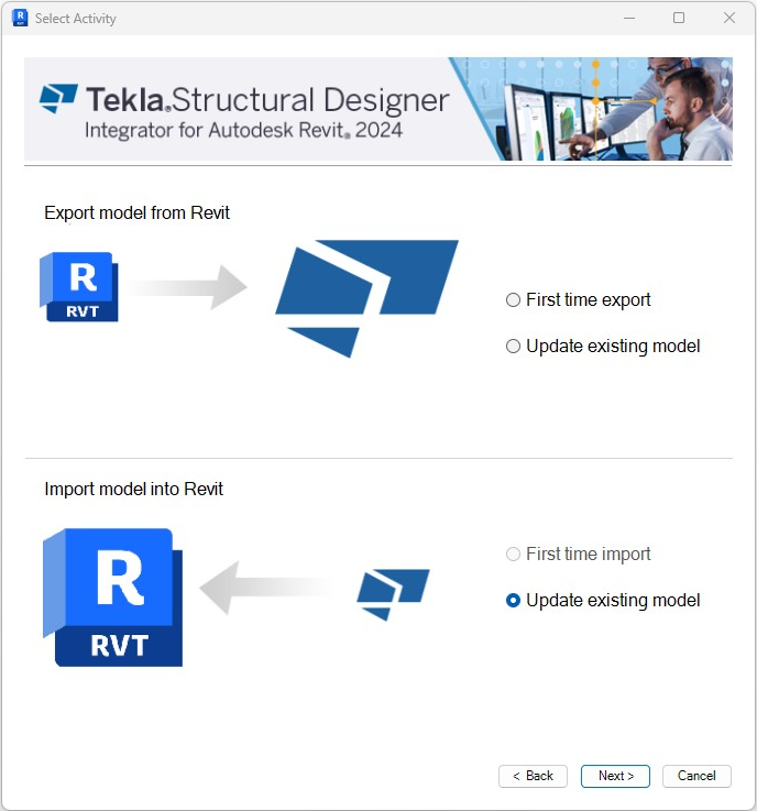In this example, we are exporting a model for use with Tekla Structural Designer. The model will be imported so that an analysis model is set up from scratch. We therefore choose the option Export model from Revit – Update existing model. Click Next to continue after making your selection.