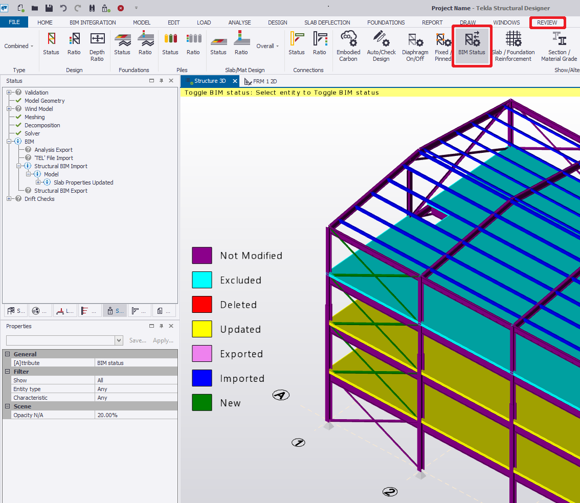 Once the synchronization process has been completed, the command BIM Status (held under the Review tab) can be used to provide a color coded indication of how the model has been affected in the last import.