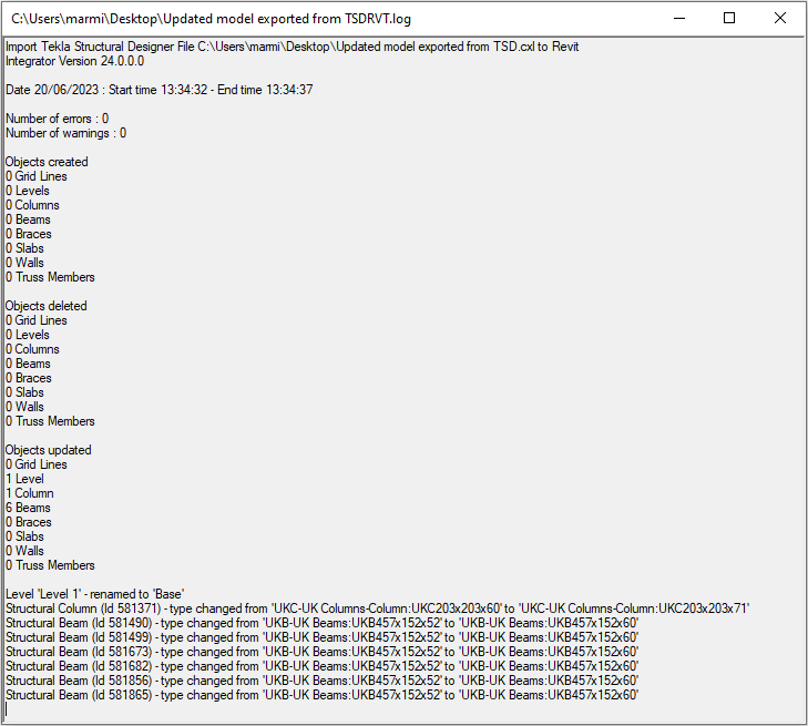 The changes are that the Datum Level Level 1 has been renamed to Base to suit the naming requirements of the Tekla Structural Designer model. The other changes relate to sectional alterations made to several beam and column member instances (Note that the reference ID for each instance is also noted).