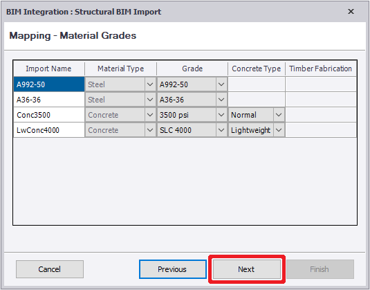 Mapping of materials to recognized grades will be shown now. Here you can view the different materials recognized in the incoming CXL file and the options to alter materials with a more preferred grade.