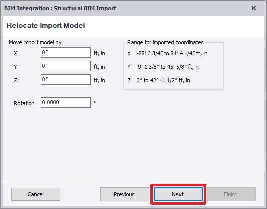 Use the exact same settings on the Relocate Import Model dialog as were used when previously importing the model into Tekla Structural Designer. If the model originated in Tekla Structural Designer, keep all values at 0 and click Next to continue.