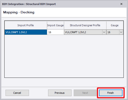 Following on from Material mapping, the dialog for Decking mapping will be shown (if applicable). Again this allows users to view the decking types being imported and have the option of overwriting the details if required.