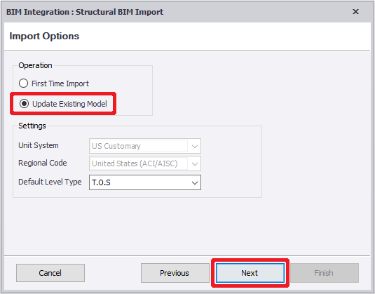 The Update Existing Model option should now be used as we are importing changes to an existing Tekla Structural Designer model.