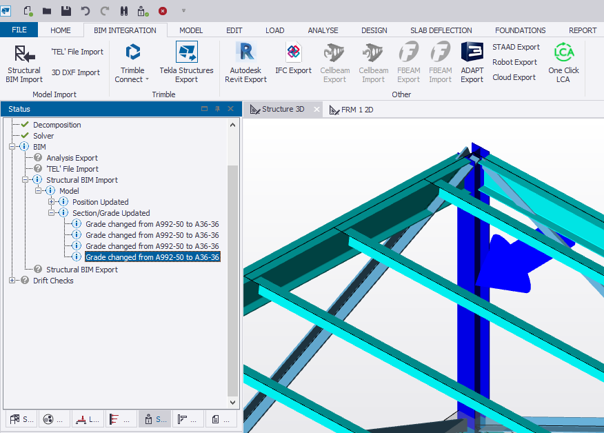 Once the synchronization process has been completed, the Structural BIM Import status tree (held under the Status tab) will show all newly created items or modifications performed by the merge process. These alterations to the model can be identified by double clicking on each entry in turn. This will highlight the affected member/object within the main Structure 3D view.