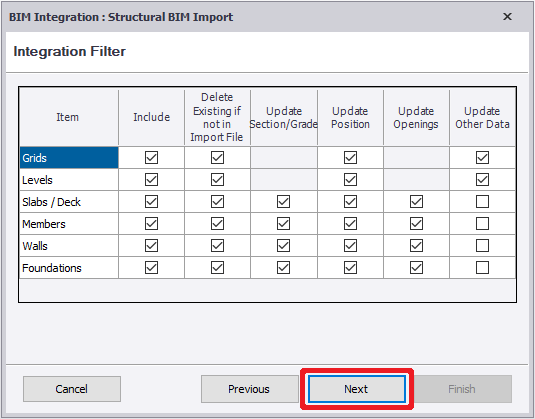 The Select Structural Objects to Import dialog allows you to control which items will be imported into Autodesk Revit. As a default, the application will automatically flag items for inclusion in the import but if you have a requirement to omit certain items (e.g. all Grids), then simply deselect the item option.