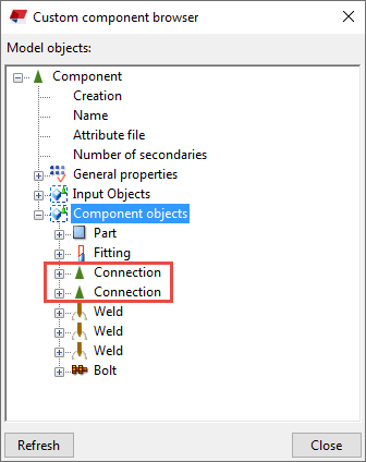 Alternatively, you can create individually the component objects that are needed in a custom component, such as parts, cuts, fittings, and bolts.