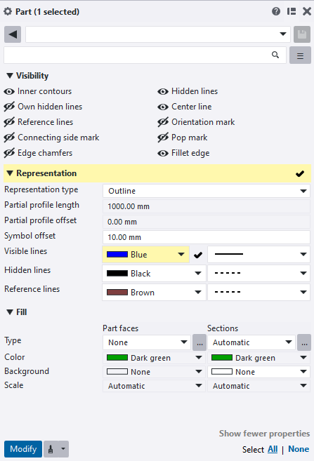 - When you change the object properties in the available sub-dialogs, the changes affect all views and objects in the drawing. For example, you can set the view scale to be the same in all views, or the color for the part mark frame to be the same for all part marks in the drawing.