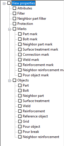 - On the view level, you can control properties related to the view, dimensioning, protection, building objects, and marks separately for each view. For example, you can define that all marks have a blue frame in the top view, or that model weld marks are shown in the front view only. You can also define selection filters that affect the selected views only.