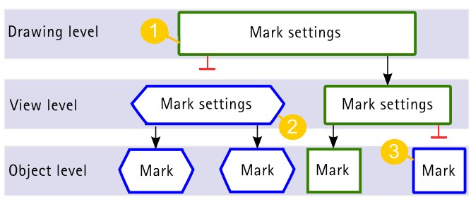 - When you change the mark frame color and shape for the whole drawing on the drawing level, the changes are passed on to the view level and to the object level.